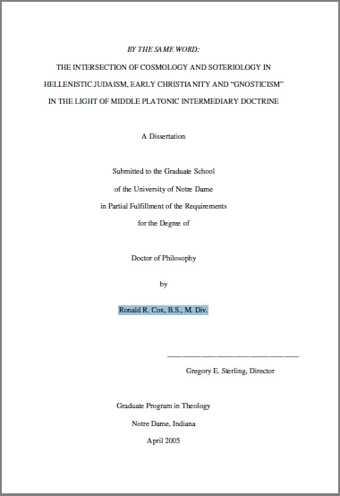 The intersection of cosmology and soteriology in Hellenistic Judaism, early Christianity and 'Gnosticism' in the light of Middle Platonic intermediary doctrine. By Ronald R. Cox, B.S., M. Div. (2005) (Dissertation).
